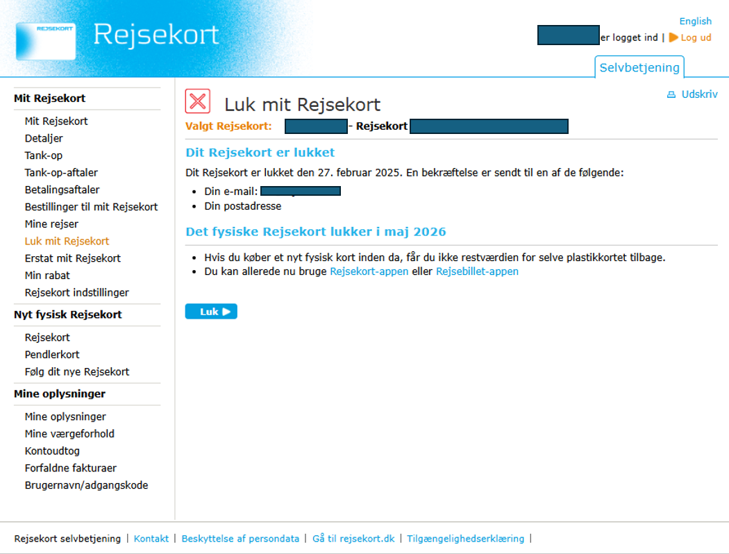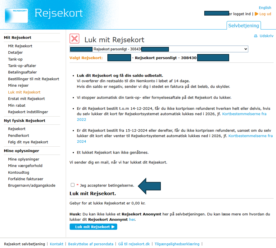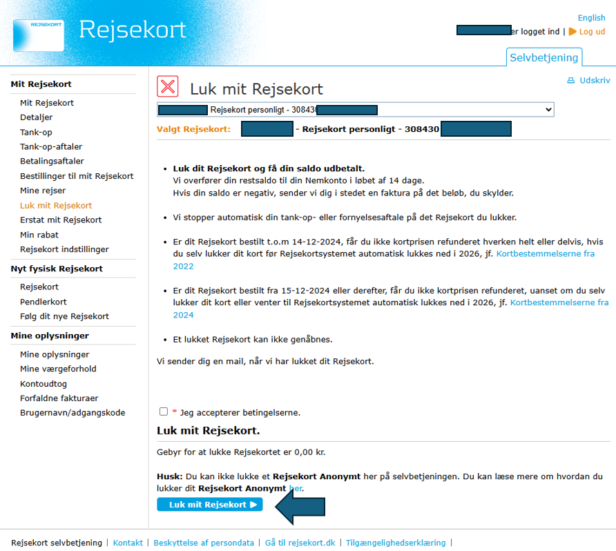 Du skal acceptere Rejsekort kortbestemmelser, før du kan lukke dit Rejsekort.