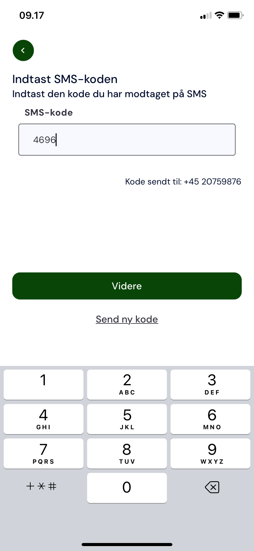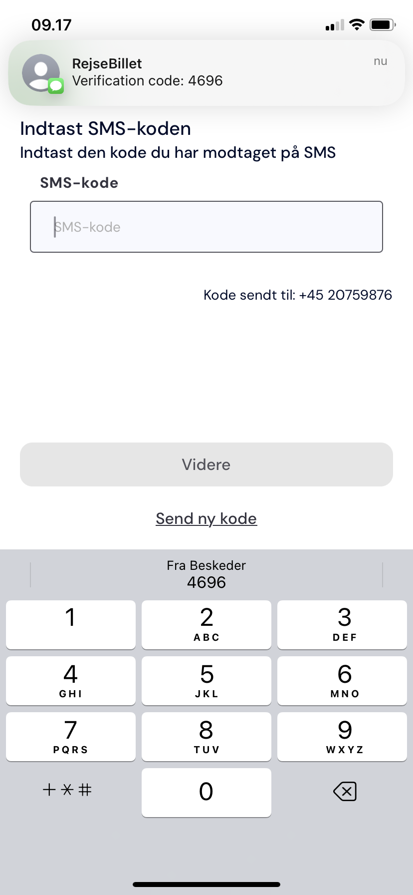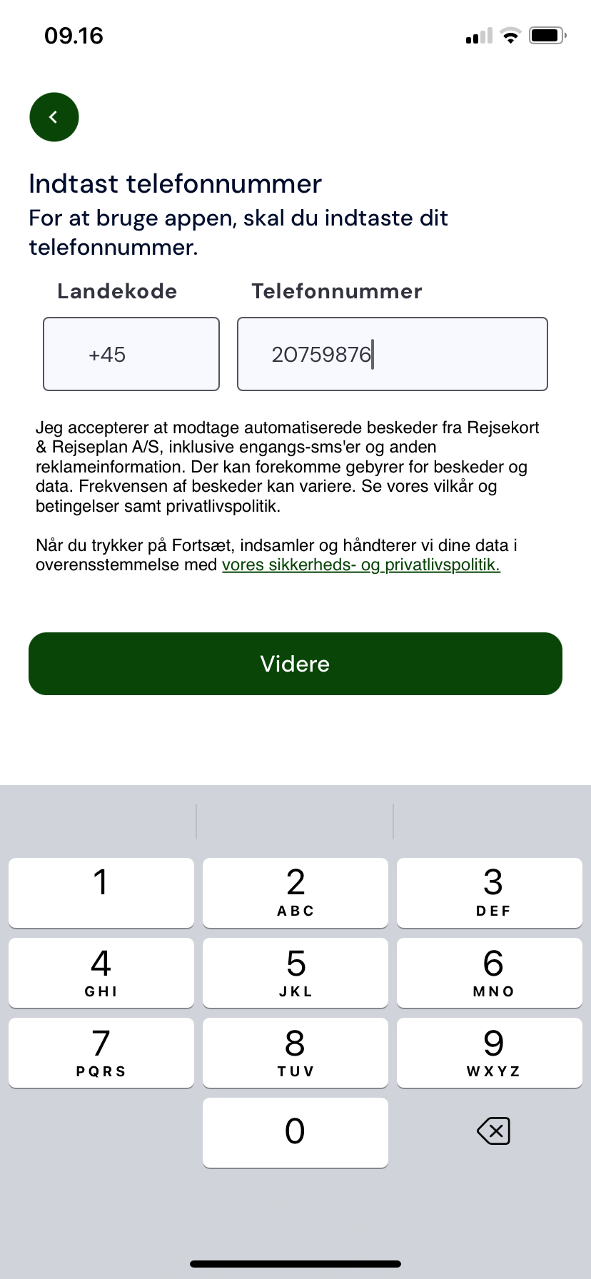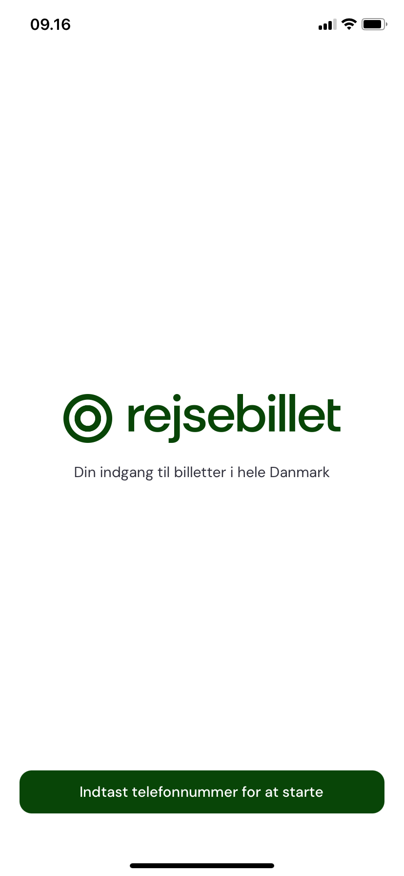 Når du har hentet Rejsebillet, skal du klikke ‘Indtast telefonnummer for at starte’.