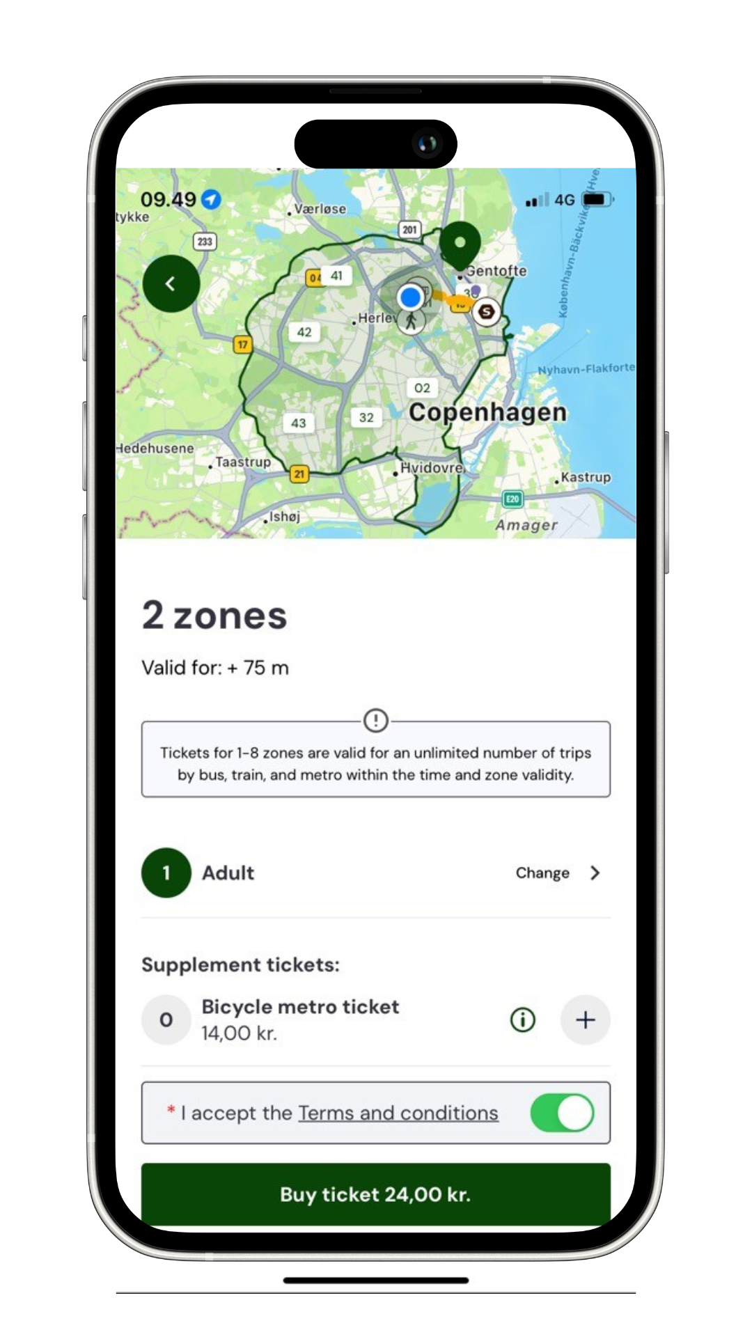 Add number of passengers, add Bicycle ticket for metro, Accept Terms and Conditions.
