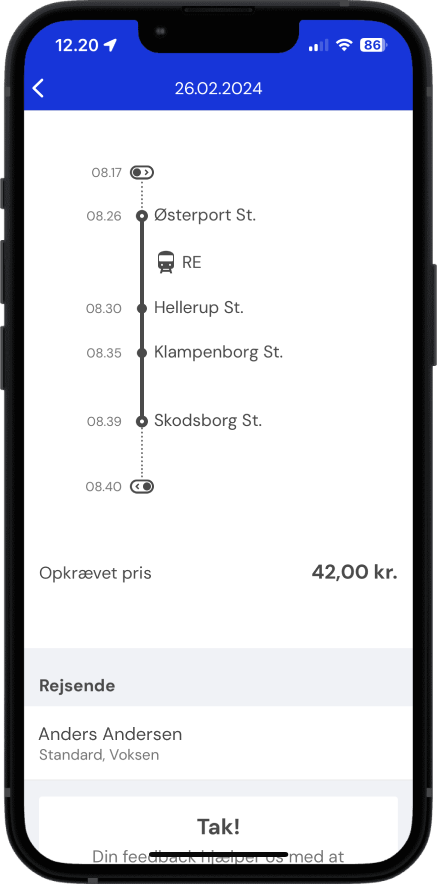 Herefter vil Rejsekort som app vise dig din samlede rejse med prisen på rejsen.