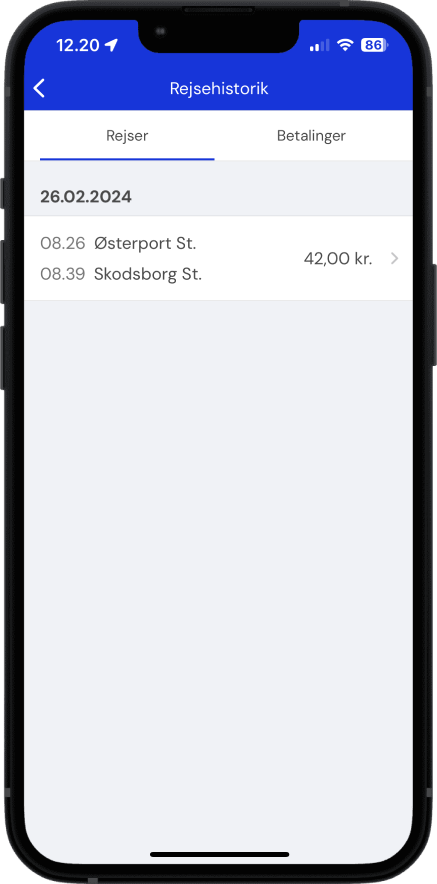 Du finder en samlet oversigt over alle dine rejser i Rejsekort som app i menuen under Rejsehistorik.